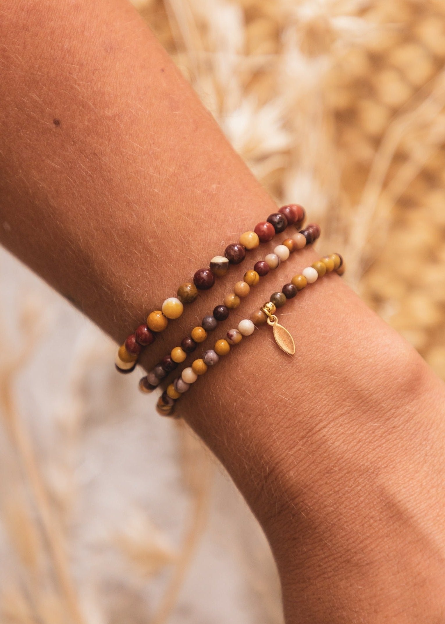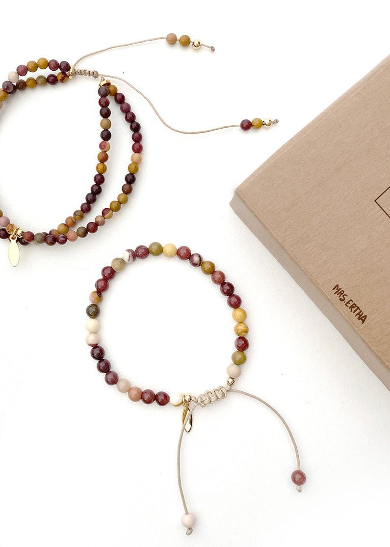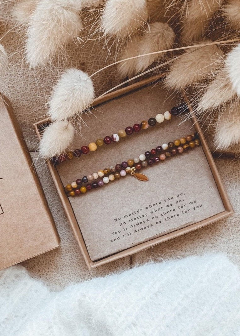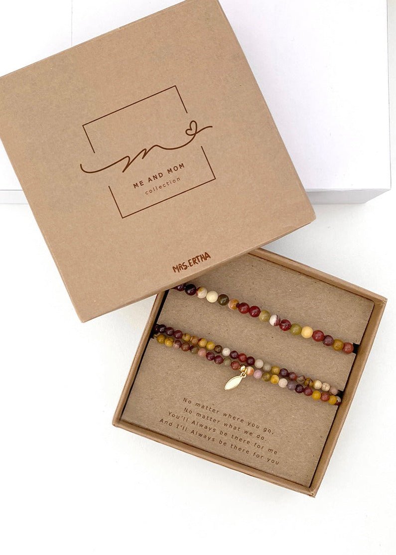 Mich &Die Mom-Kollektion umfasst sieben Armbänder aus Natursteinen, jedes mit seiner eigenen Bedeutung. Dank der 24-karätig vergoldeten Kupferelemente sind sie einzigartige Schmuckstücke mit einer ganz besonderen Botschaft. Nun können Mütter und Kinder dasselbe Armband tragen und gemeinsam dieselbe Botschaft übermitteln.