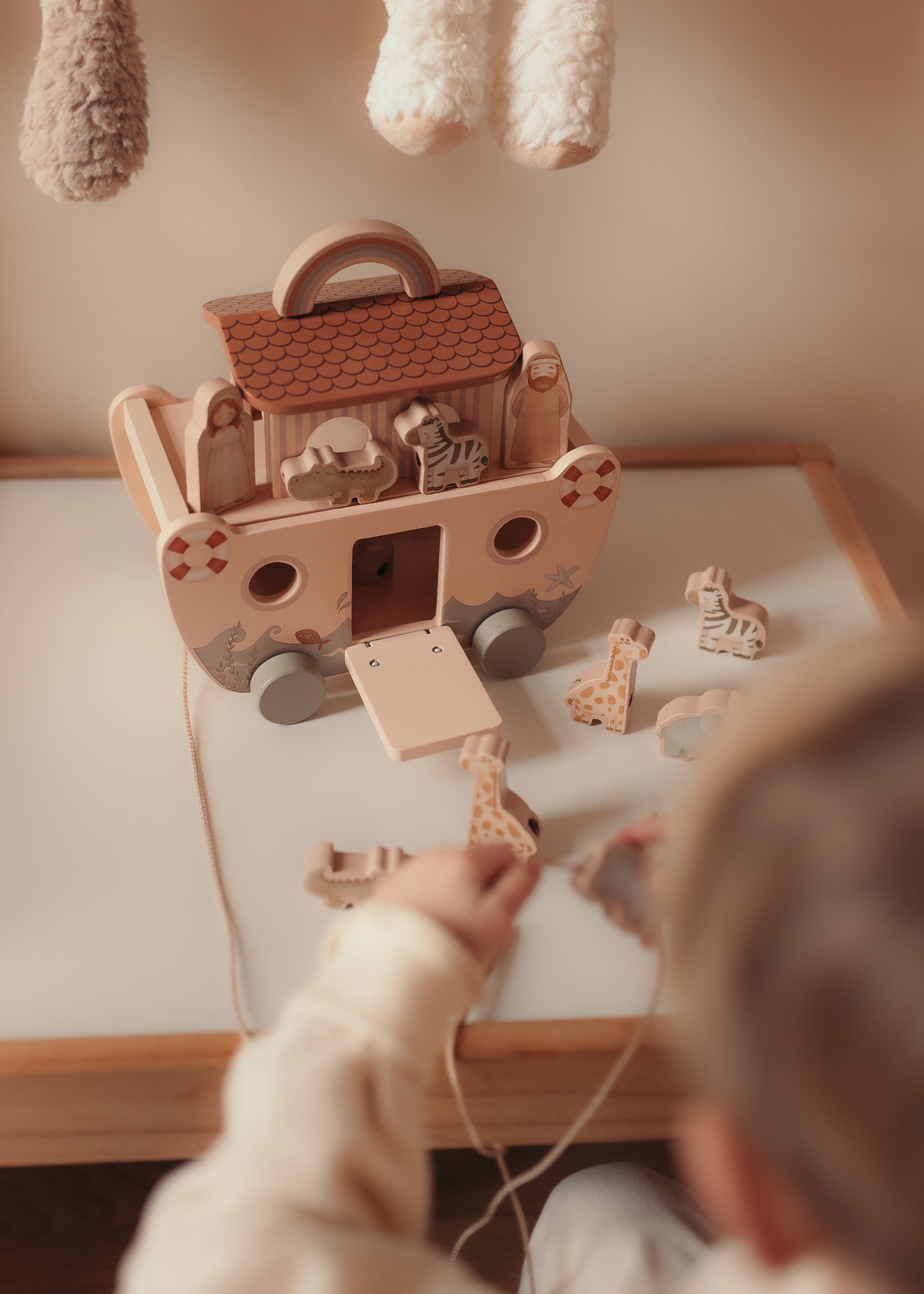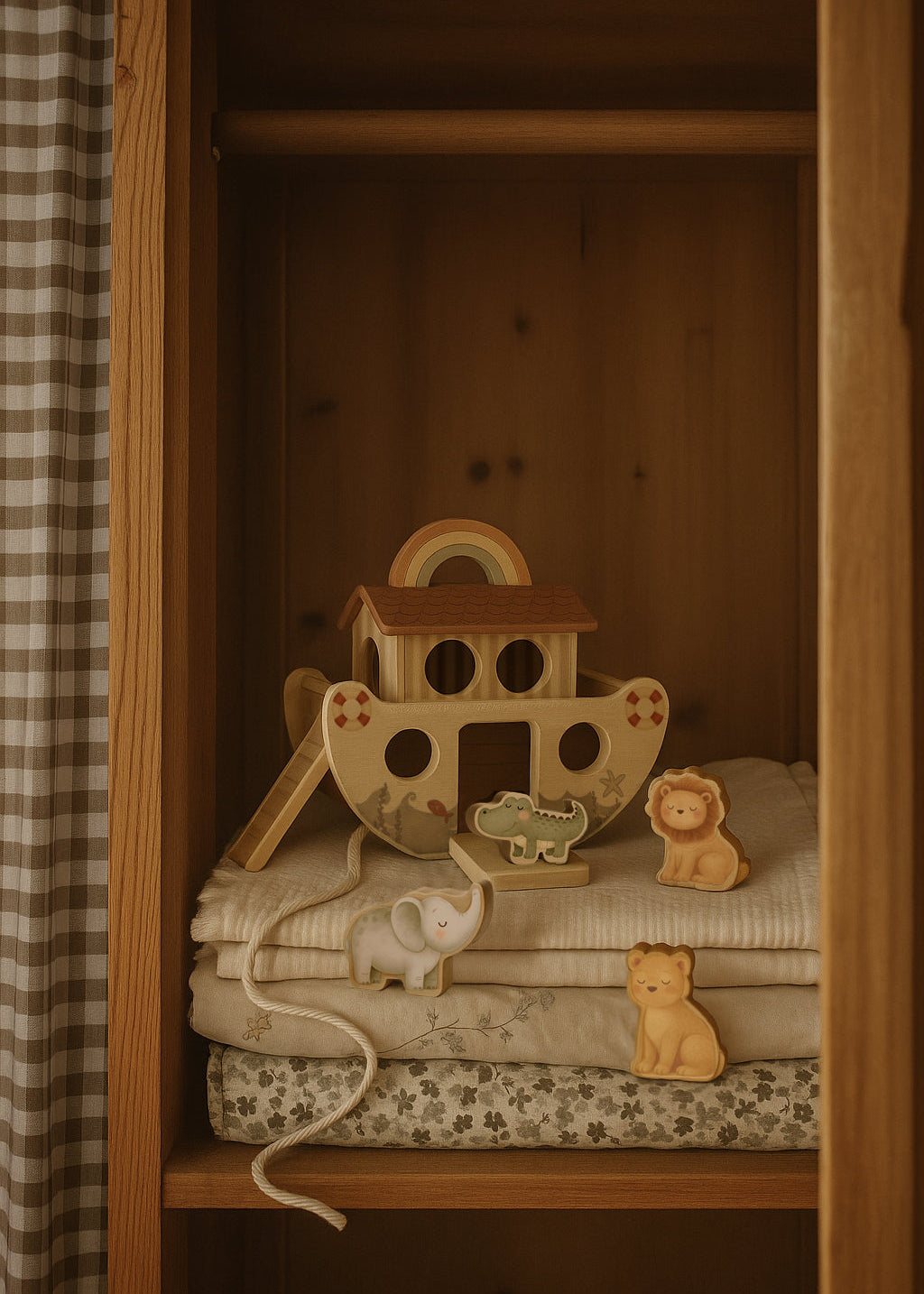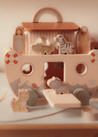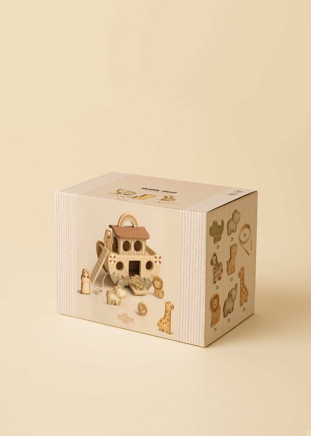 Enthält 22 Teile: 14 Tiere, ein Boot mit Rädern, einen Regenbogen, eine Rampe und eine Schnur mit Holzspitze zum Durchfädeln der Tiere – ideal, um die Feinmotorik von Kindern zu fördern. Perfekt zum Spielen, Lernen und für unzählige Abenteuer!