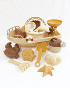 Our summer beach toy set, especially for babies and children, is made from recycled bottles and consists of 14 pieces that will be part of the little ones' imaginary adventures: 4 shovels, 6 molds, 1 watering can, 1 bucket, 1 watermill and 1 boat.